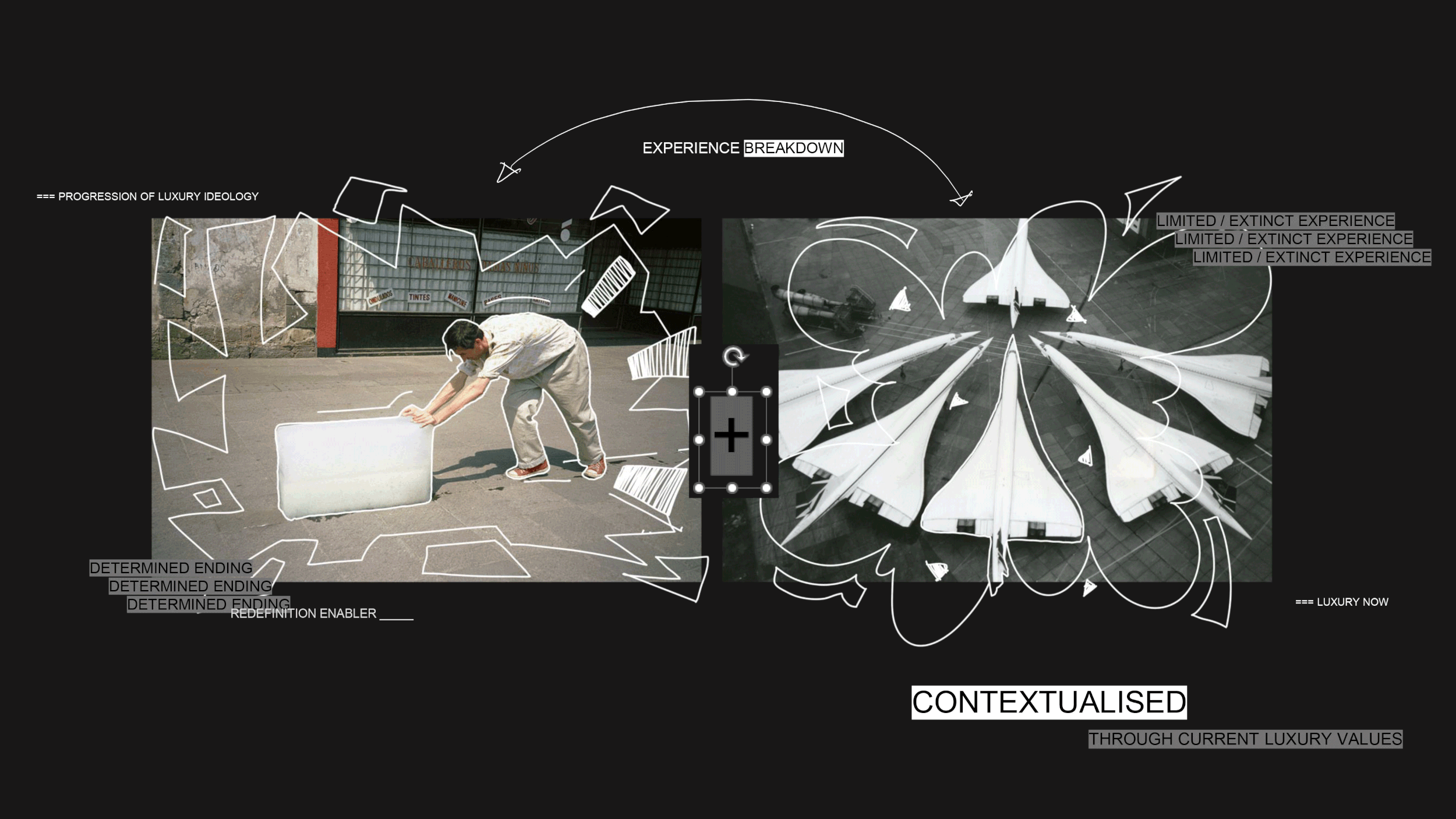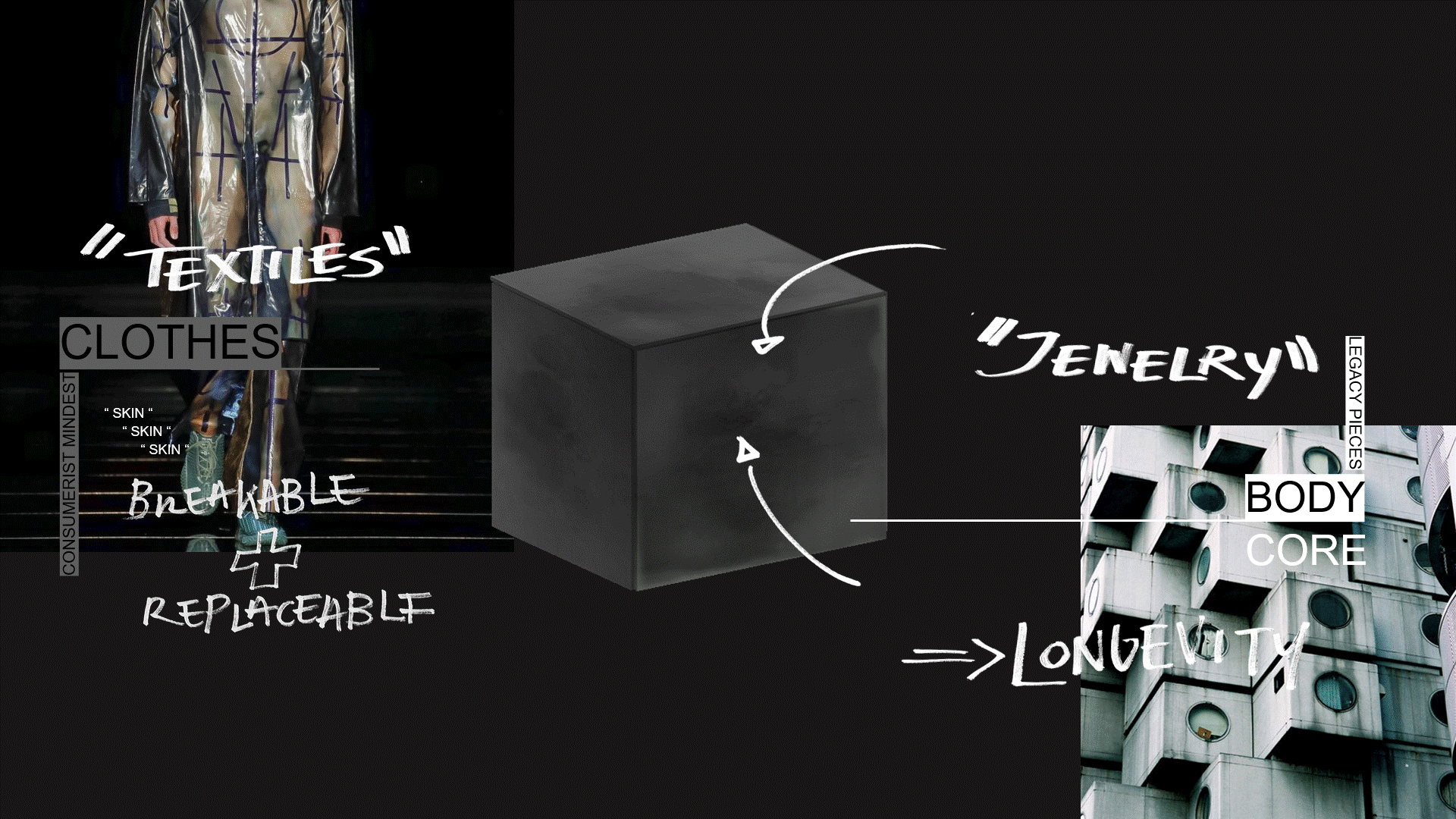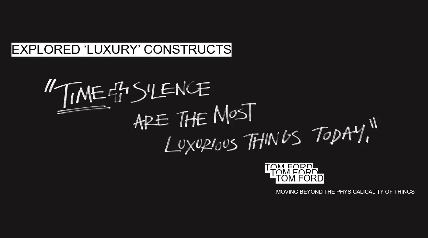 ACKNOWLEDGING THE NEEDS + DESIRES OF A MODERN HUMAN MINDSET BUT BUILDING A STORY WHICH CELEBRATES THE LIFE OF MATERIALITY THROUGH MATERIAL STORIES WHICH CREATE INDIVIDUAL EXPERIENCES OF BEING PRESENT WITH THAT ARTEFACT WITHIN THAT POINT IN TIME. MOVING AWAY FROM CURRENT LUXURY VALUES OF THE PHYSICALITY OF THINGS TO EXPERIENCE BASED. IDEAS OF WHICH THAT HAVE BEEN PREVIOUSLY EXPLORED BY TOM FORD WHERE HE STATES ‘TIME + SILENCE ARE THE MOST LUXURIOUS THINGS TODAY.’
