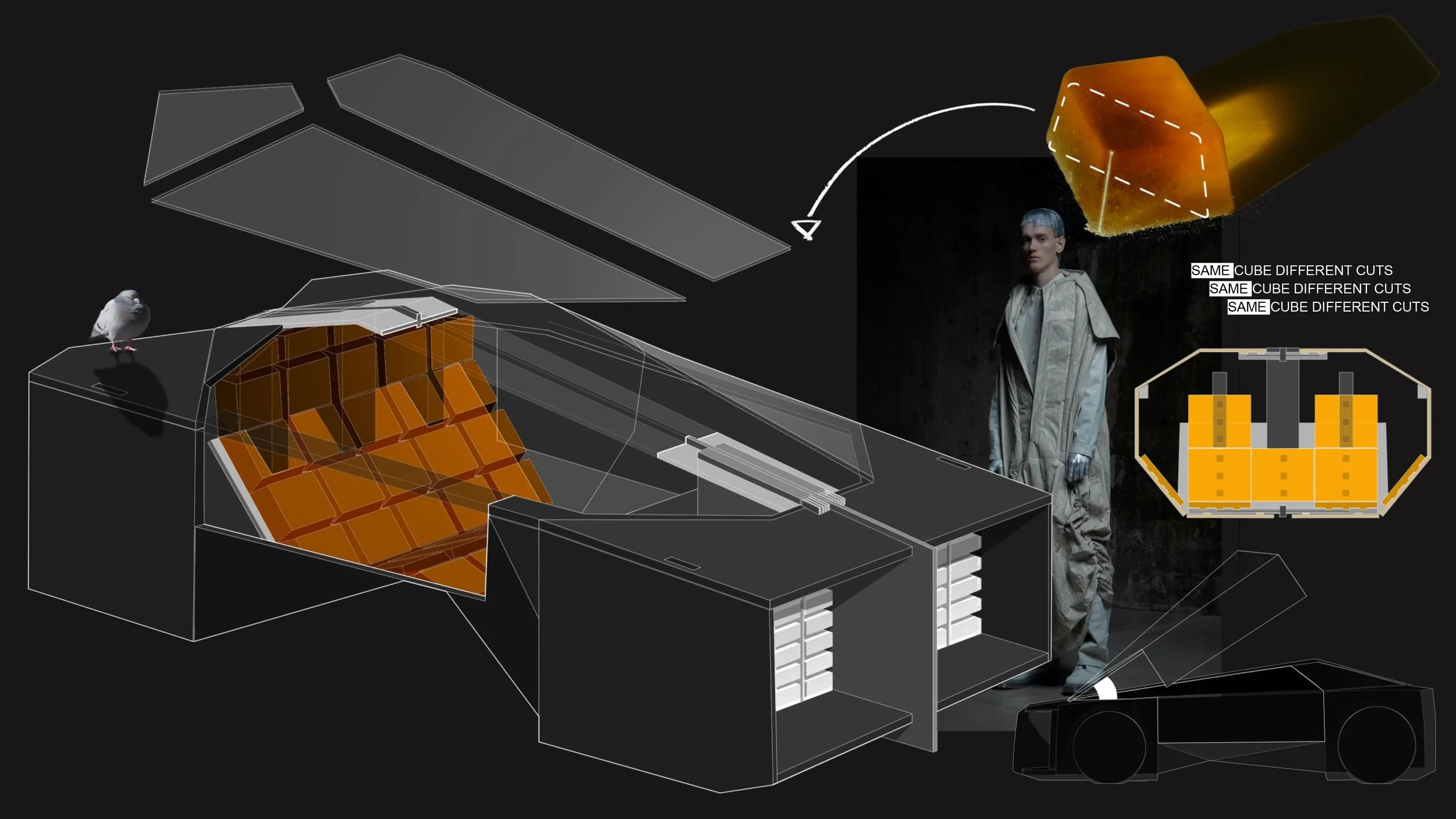 AS A CORE PIECE OF ‘JEWELLERY’, THE MAIN BODY OF THE VEHICLE IS BUILT FOR LONGEVITY. A CONSTRUCTION PIECE WHICH ALLOWS FOR THE CLOTHES TO BE ATTACHED AND DETACHED FROM. THIS CORE PIECE HOUSES THE TECH AND MAIN STRUCTURE OF THE VEHICLE, THE PIECES WHICH REMAIN A CONSTANT AS FASHION AND DESIRABILITY CHANGE AT A RAPID PACE.