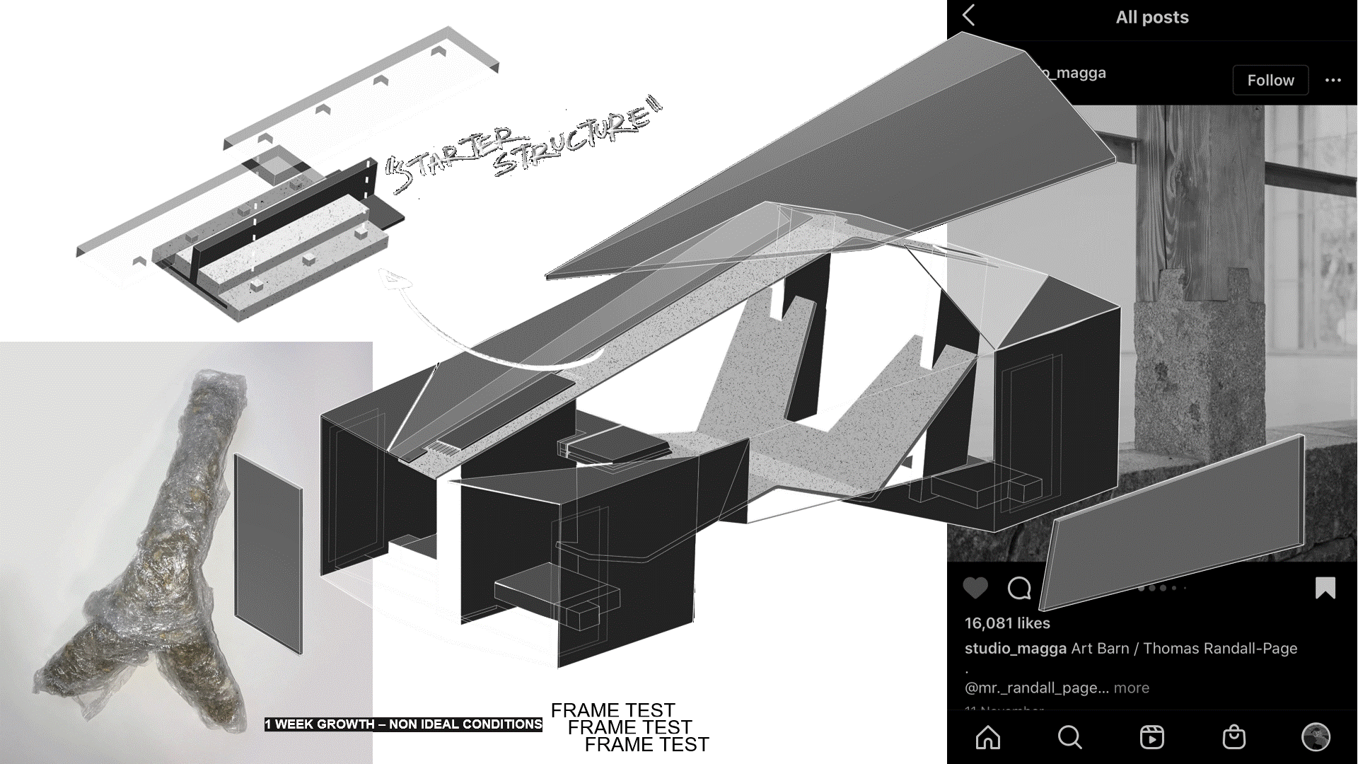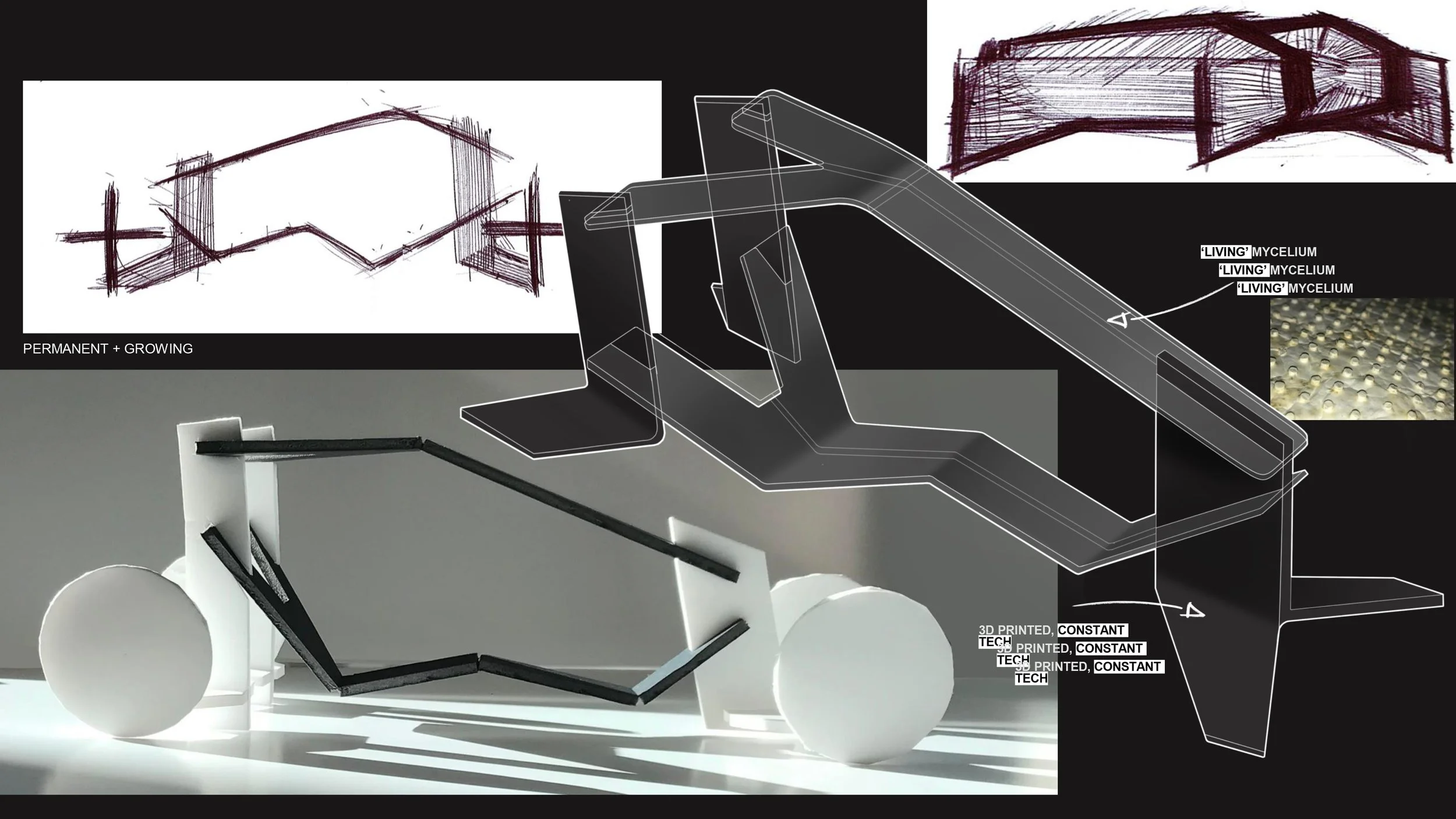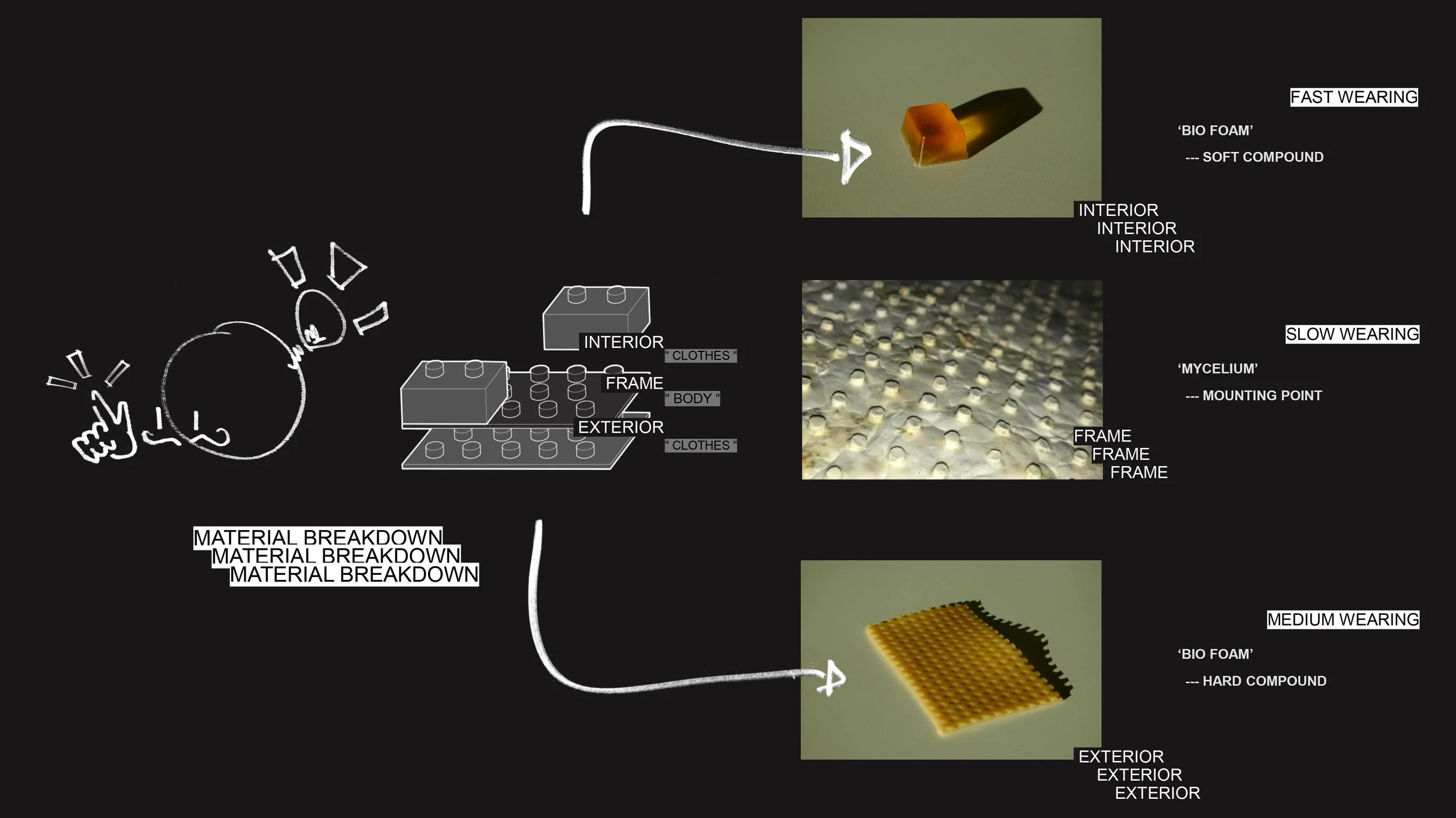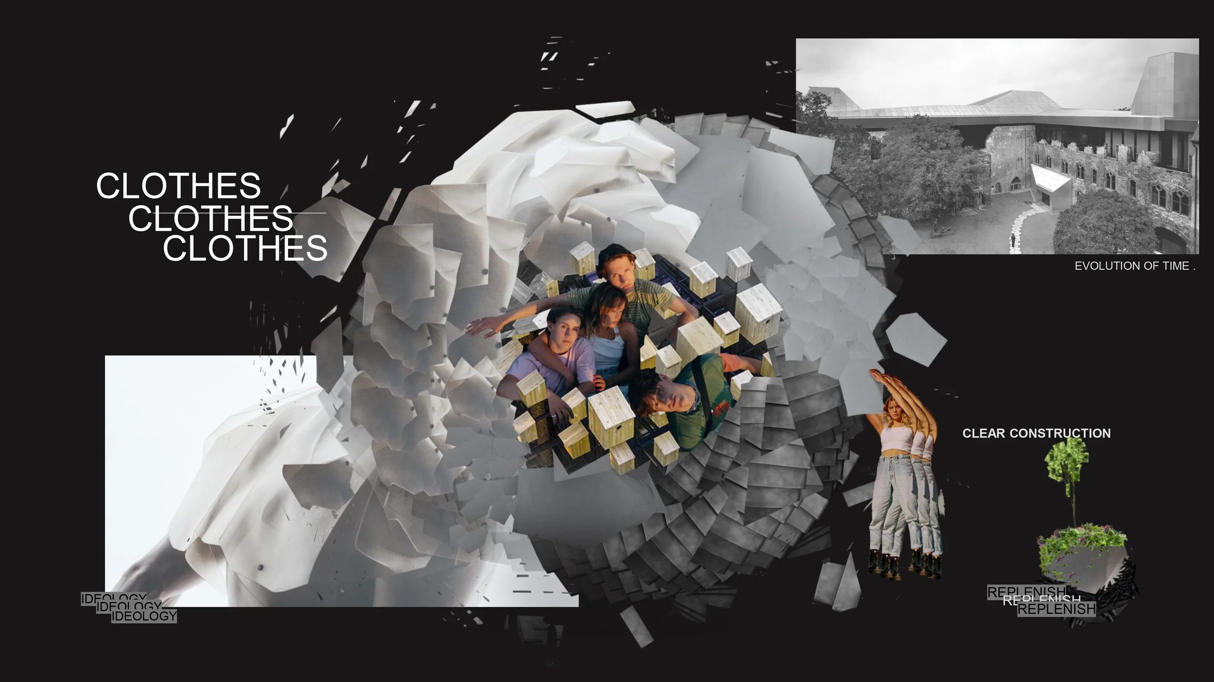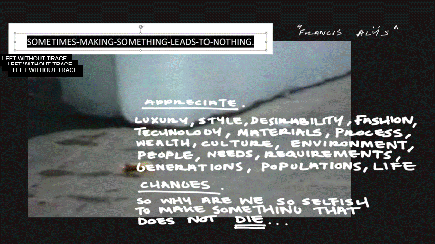 THE SECONDARY COMPONENT OF THE CONCEPT ARE THE CLOTHES. PROPOSED AS REGENERATIVE, BIO-MATERIAL, ‘TEXTILE’ PANELS. TAKING AN ANTHROMORPHIC LIFESPAN THAT IS SHORTER + PREDETERMINED. INSPIRATION IS DRAWN FROM ‘SOMETIMES SOMETHING LEADS TO NOTHING’ FRANCIS ALŸS’.