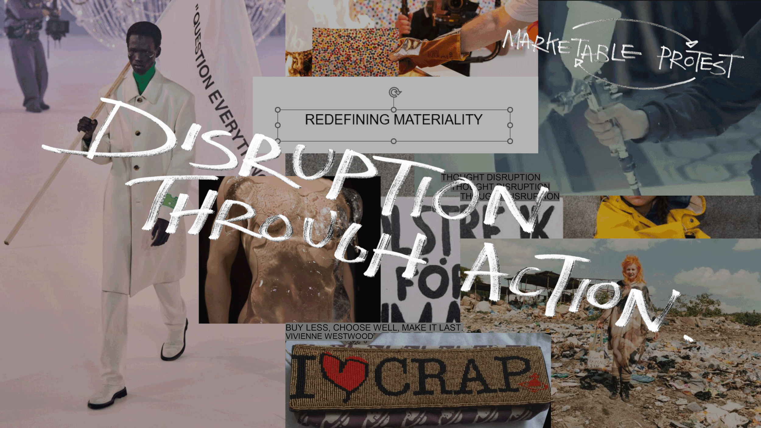 THIS HAS LED TO GLOBAL CHANGE IN ROUTINE CREATING A MINDSET CHANGE WITHIN CONSUMERS + PRODUCERS. THERE HAVE BEEN EARLY ONSET INDICATORS OF THIS SOCIAL CHANGE THROUGH THE POSITIONING OF FASHION LABELS LIKE ‘VIVIENNE WESTWOOD’ + ACTIVIST GROUPS SEEN CAUSING SOCIAL DISRUPTION IN LONDON.
