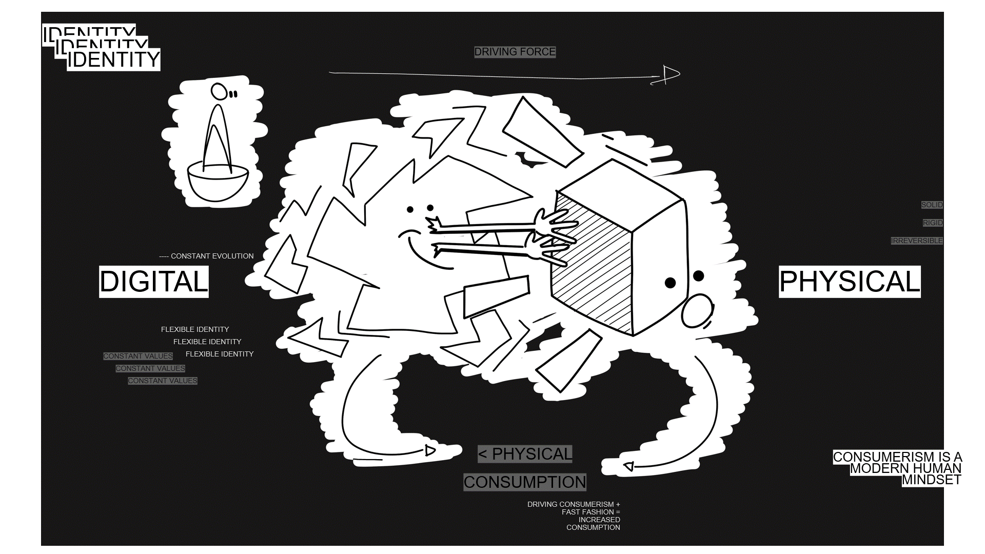 THE BASIS FOR ‘UNMASTERED’ SITS WITHIN A ‘CONCEPT 2040 WORLD’ SPACE – WHERE THE INHERENT HUMAN NEED + DESIRE FOR CONSUMERISM AND OVERCONSUMPTION CONTINUES TO BE A THREAT TO OUR WAY OF LIFE DUE TO CONTINUED GLOBAL WARMING. THIS NEED FOR CONSUMPTION IS HEIGHTENED EXPONENTIALLY DUE TO THE EVER-CHANGING + FLEXIBLE INFLUENCE OF THE DIGITIZATION OF OUR DAILY LIVES, PUSHING PEOPLE TO CONSTANTLY INTERACT WITH NEW INFORMATION CREATING A KNOCK-ON EFFECT ON THE CONSUMPTION OF PHYSICAL THINGS.